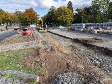+++ 09.10.2025: Das Pflaster der Parkstände ist teilweise aufgenommen und die Böschung entfernt. Pflaster und Bordsteine wurden zur späteren Wiederverwendung gelagert.