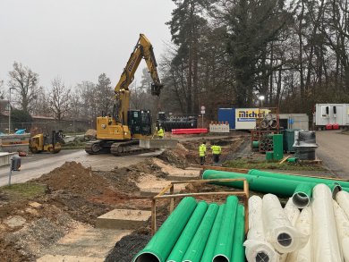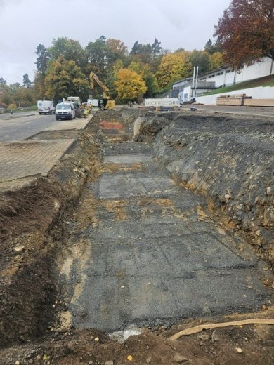 +++ 27.11.2025: Die Fertigteilfundamente sind gesetzt. Parallel erfolgen Arbeiten zur Kanalsanierung. Derzeit werden Vorbereitungen zur Herstellung des Mulden-Rigolen-Systems vorgenommen.