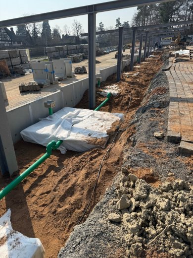 +++ 12.03.2026: Nach dem anhaltenden Winter hat die Baustelle wieder Fahrt aufgenommen. Die Rigolenanlage ist zum größten Teil fertig gestellt und es wird parallel begonnen, die Stellplatzflächen wieder zu pflastern. In Kürze beginnt der Stahlbauer, die Carportkonstruktion zu errichten.