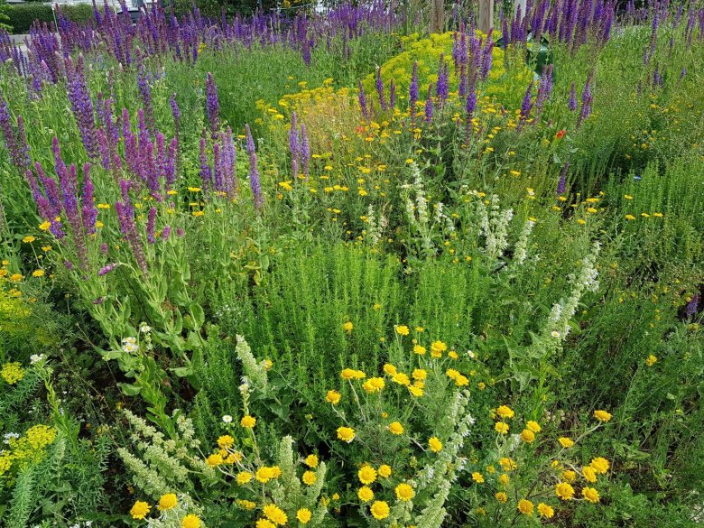 Anstatt pflegeintensivem Wechselflor, der mehrfach im Jahr ausgetauscht wird, werden Stauden verwendet. Sie sind mehrjährig, brauchen weniger Wasser, keinen Dünger und müssen nur einmal pro Jahr, im Frühjahr, geschnitten werden. Sie bieten Insekten und Vögeln Nahrung und Lebensraum. Diese naturnahe Bepflanzung zeigt über das Jahr immer wieder einen anderen Blühaspekt und sollte vor dem Winter nicht zurückgeschnitten werden, denn in den alten Pflanzenteilen und im geschützten Boden bietet sie warme Winter-Quartiere für zahlreiche Tiere. Eingerollt in Blättern oder in den Stängeln - als Ei, Puppe oder Raupe überwintern dort Insekten. Auch hält die Pflanzendecke den Boden warm und sorgt so für einen behaglichen Unterschlupf für Kleinsäuger und Vögel. Die Samen der Pflanzen sind im Winter zudem eine wichtige Nahrungsquelle. Weil „wilde Bereiche“ für den Erhalt der biologischen Vielfalt sehr wichtig sind, sieht es dort nicht immer ordentlich aus. Nur so können Schmetterlinge, Wildbienen, Vögel und andere Tiere auch in Zukunft überleben.